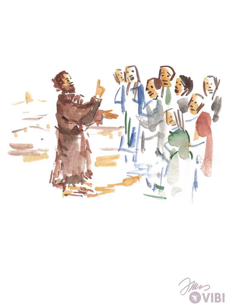 In der Wüste ist ein Mann namens Johannes der Täufer. Viele Menschen hören ihm zu. Er sagt: "Ihr habt viele Sünden und viele falsche Dinge gemacht! Hört auf damit! Gott kann euch neu machen und verändern!"