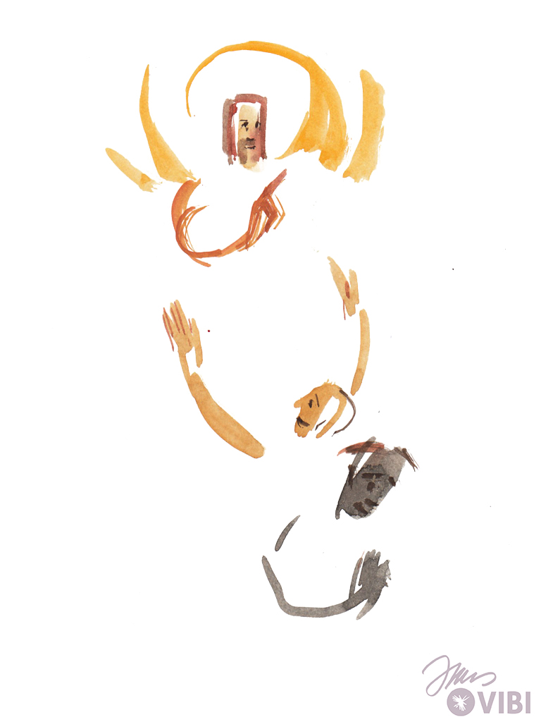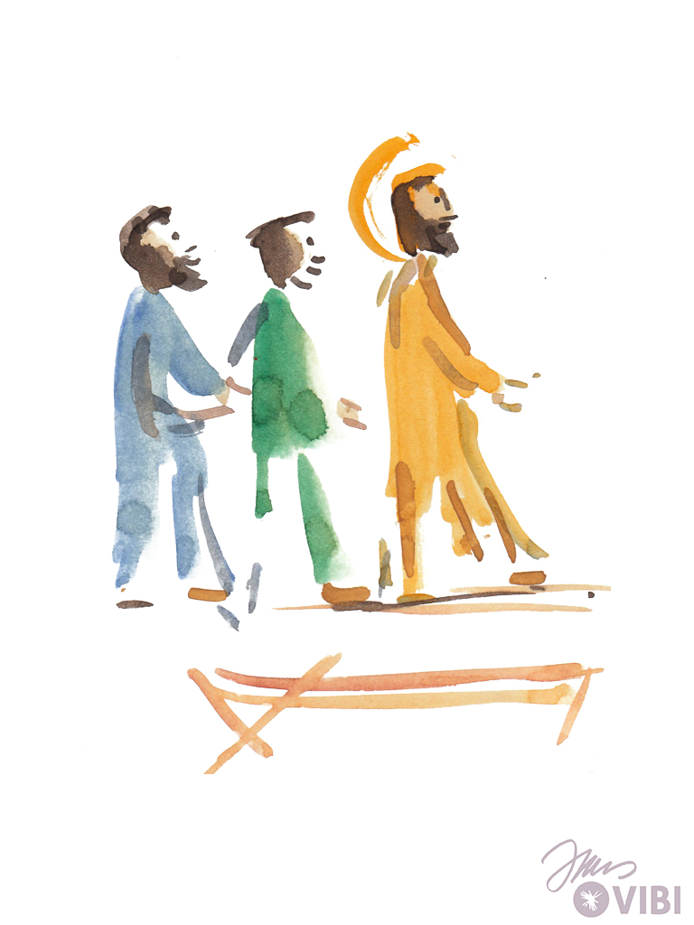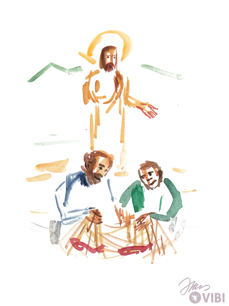 JESUS UND DIE BEIDEN GEHEN WEITER. SIE SEHEN ZWEI ANDERE FISCHER. SIE HEISSEN JAKOBUS UND JOHANNES. SIE REPARIEREN GERADE IHRE NETZE. IHR VATER HEISST ZEBEDÄUS.