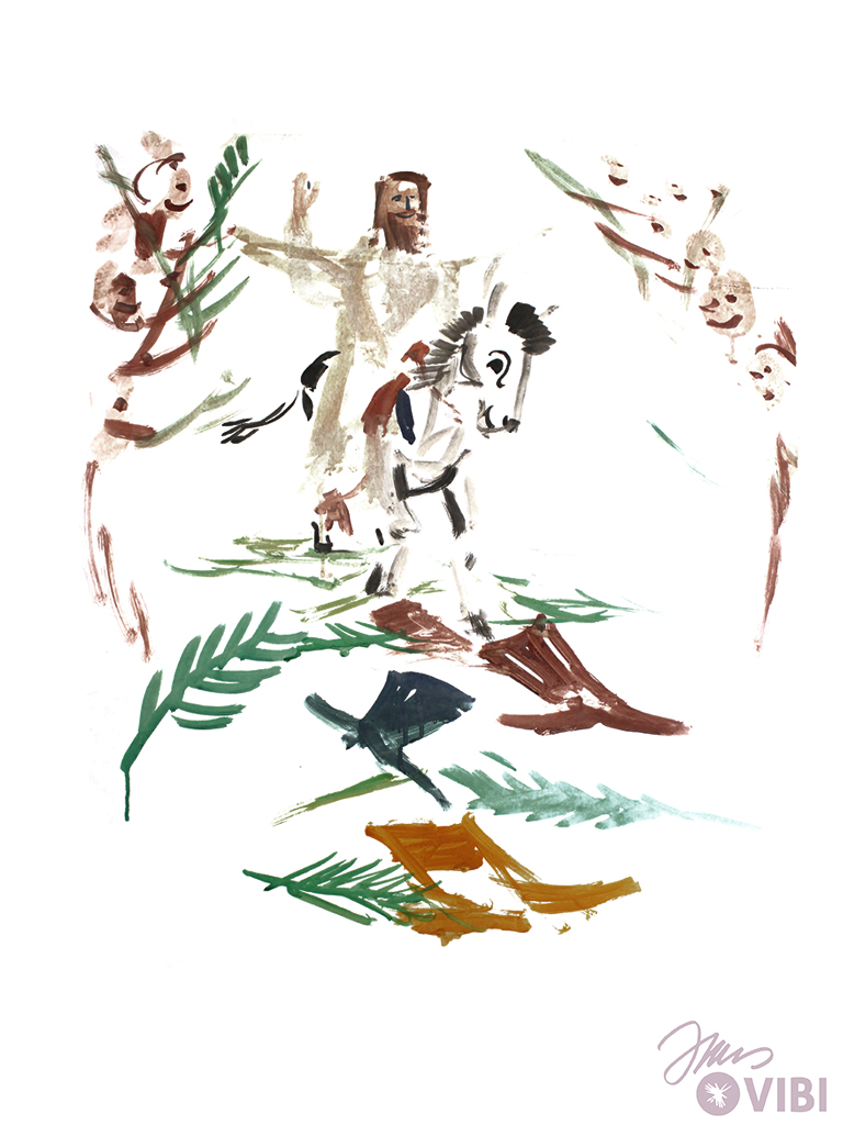 JESUS RIDES ON THE DONKEY. THE PEOPLE SCREAM: "JESUS YOU ARE KING!"THEY PRAISE JESUS AND ARE VERY HAPPY.