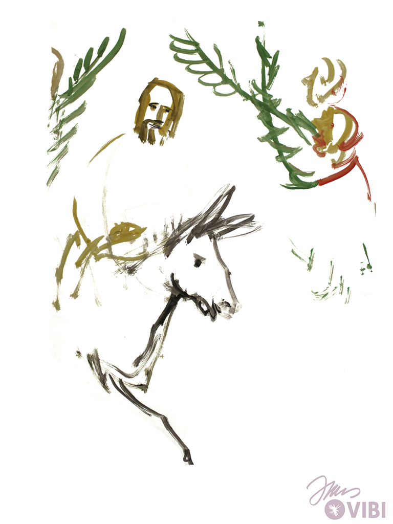 JESUS STROKES THE DONKEY. HE LOVES THE DONKEY. THERE ARE CLOTHES ON THE DONKEY. JESUS GETS ON THE DONKEY.