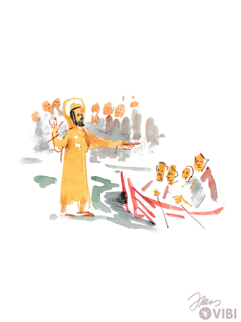 VIELE MENSCHEN SIND DA. JESUS ERZÄHLT VIEL. ER SAGT SEINEN FREUNDEN: FAHRT MIT DEM SCHIFF LOS! ICH MÖCHTE ZU DEN LEUTEN NOCH 'BABA' SAGEN.“