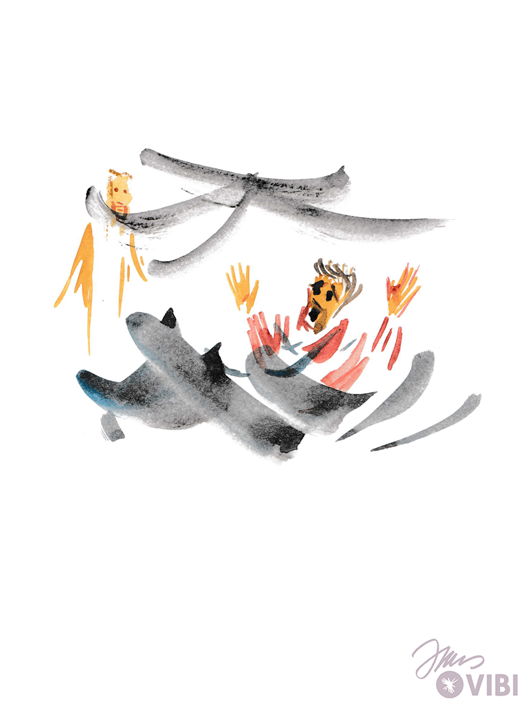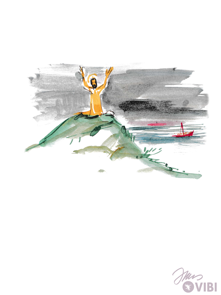 Viele Menschen sind da. Jesus erzählt viel. Er gibt seinen Freunden einen Auftrag: Fahrt mit dem Schiff ans andere Ufer! Ich möchte mich noch von den Menschen verabschieden.“
