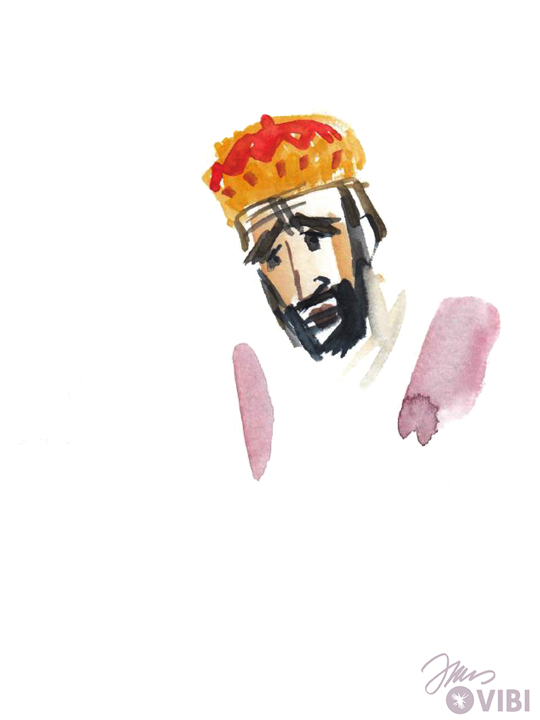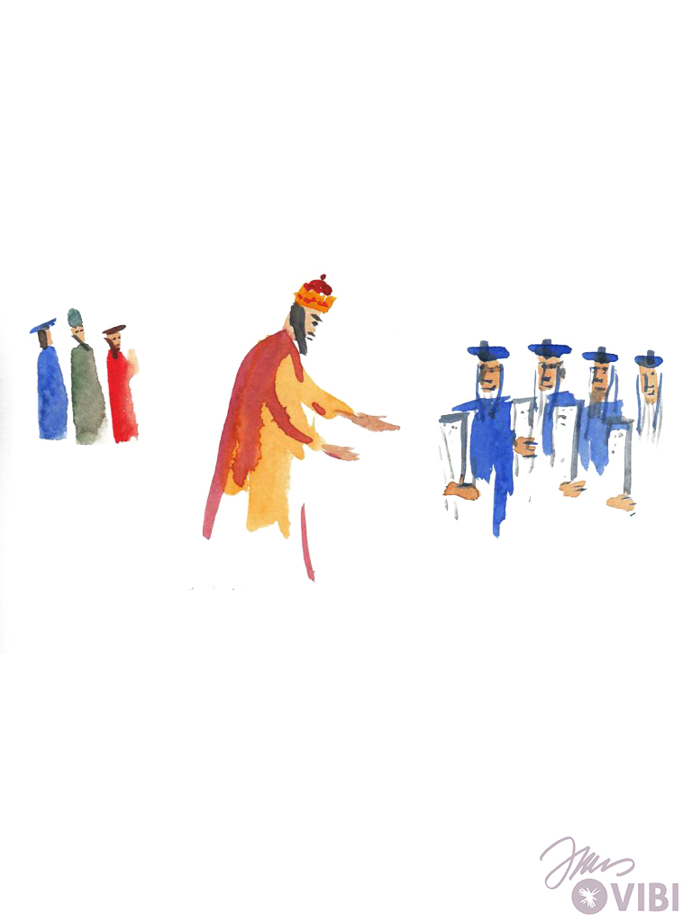 HEROD QUICKLY ASKS SOME PEOPLE, WHO KNOW A LOT. HE ASKS THEM: „WHERE IS THE NEW KING WHO HAS BEEN BORN? LOOK IN YOUR TEXTS AND TELL ME!“