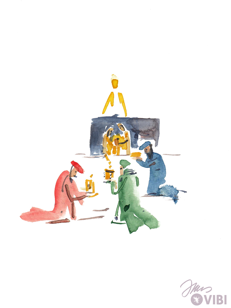 THE THREE WISE MEN COME TO A HOUSE. MARY IS THERE WITH JESUS ON HER ARMS. THE THREE WISE MEN BOW DOWN AND WORHSIP JESUS. THEY GIVE HIM GOLD, FRANKINCENSE AND MYRRH.